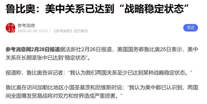 鲁比奥那句“战略稳定”不是临时起意,而是博弈后的结论,中美打得有来有回,美国才确认一件事,中国不仅能扛,还能迭代升级。