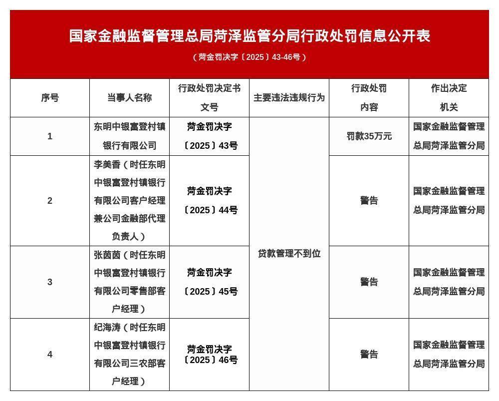 罚单显示,东明中银富登村镇银行有限公司的主要违法违规事实(案由)为:贷款管理不到位。